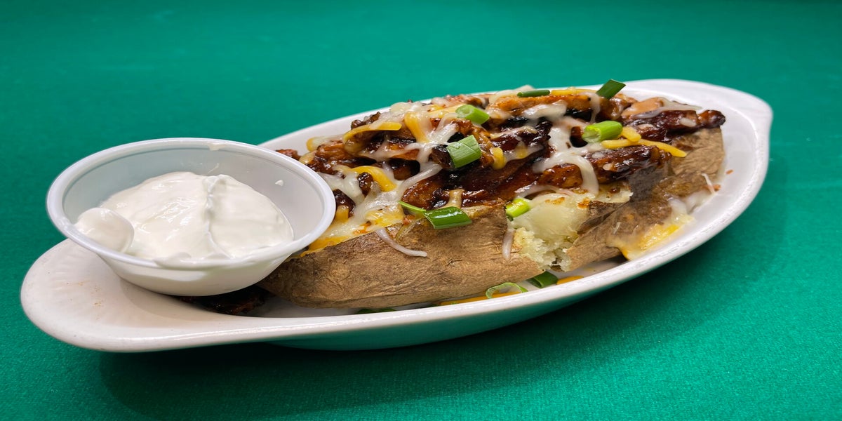| LOADED BAKED POTATO: Topped with Butter, Sour Cream, Chives, Bacon Bits, Shredded Cheese and your choice of Smoked Brisket, Pulled Pork or Grilled Chicken. | $13.25 |